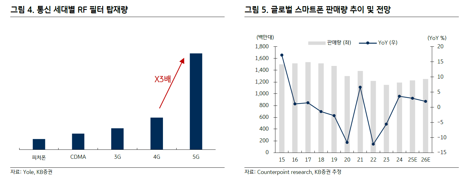 과거 4G에서 5G로 전환될 때 스마트폰당 RF 필터 탑재 개수는 약 3배 증가했다. 쏘닉스의 6인치 TF-SAW 필터 역시 향후 5G·6G 단말 확대 구간에서 채택 증가가 기대된다.