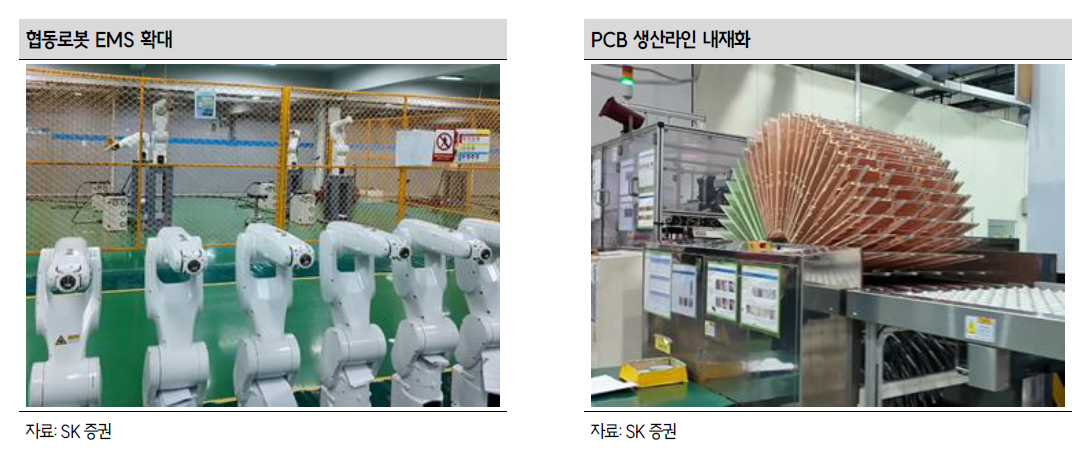 - ESS/EV/반도체 장비 등 다양한 하우징·부품 경험 + 글로벌 EMS의 제조 범위 확대 + PCB 등 핵심부품 내재화 역량을 근거로, 로봇/자동화 장비용 메탈 부품·프레임·조립 영역 확장을 기대할 수 있다고 봤습니다.